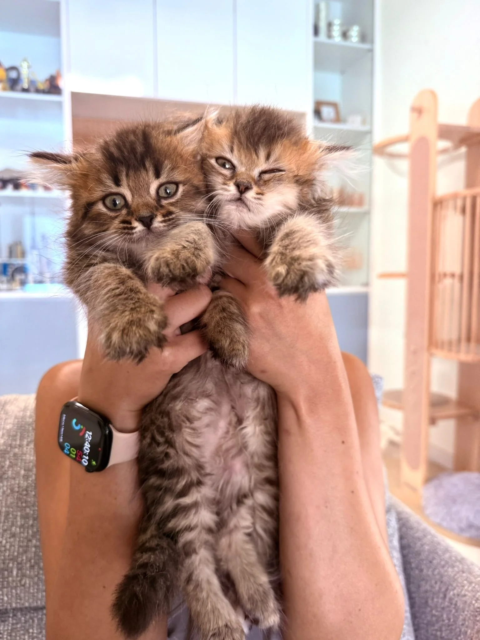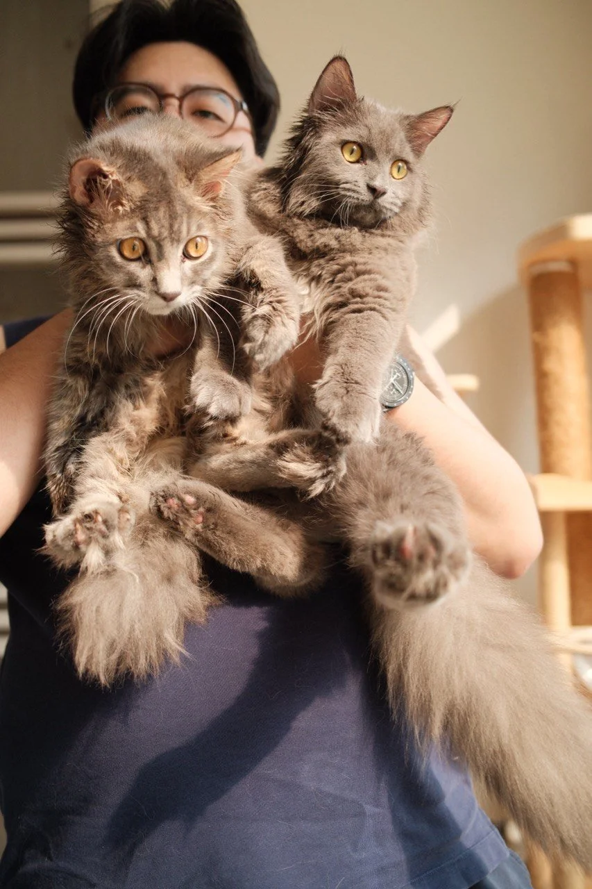 Personality: Summer is super sweet and loving. She loves to knead the air when she’s relaxed. Winter is easily carried and loves cuddles! Both of them enjoy being petted.